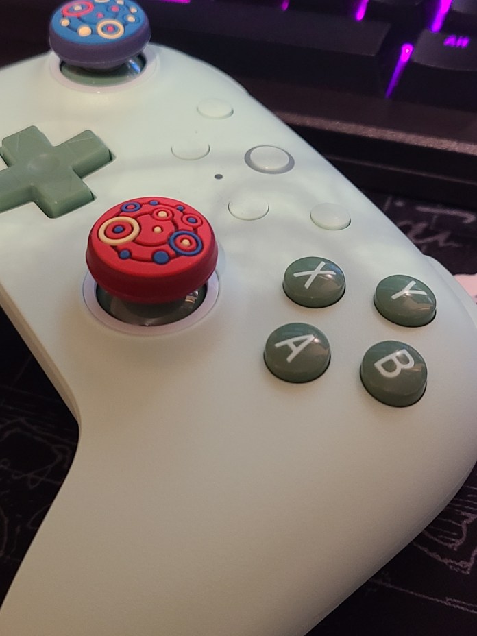 该控制器有六种不同的柔和色调(薄荷色、桃色、绿色、紫色、蓝莓色和布朗尼色)可供选择,因此在风格上毫不妥协。在这篇评论中,我得到了薄荷色,虽然我不是绿色的最大粉丝,但我确实认为薄荷色看起来真的很棒。四个正面按钮、方向键和拇指杆具有较深的橄榄色,我认为它与 Mint 控制器外壳的浅色搭配得很好。与控制器一起获得的适配器也与外壳颜色匹配。
