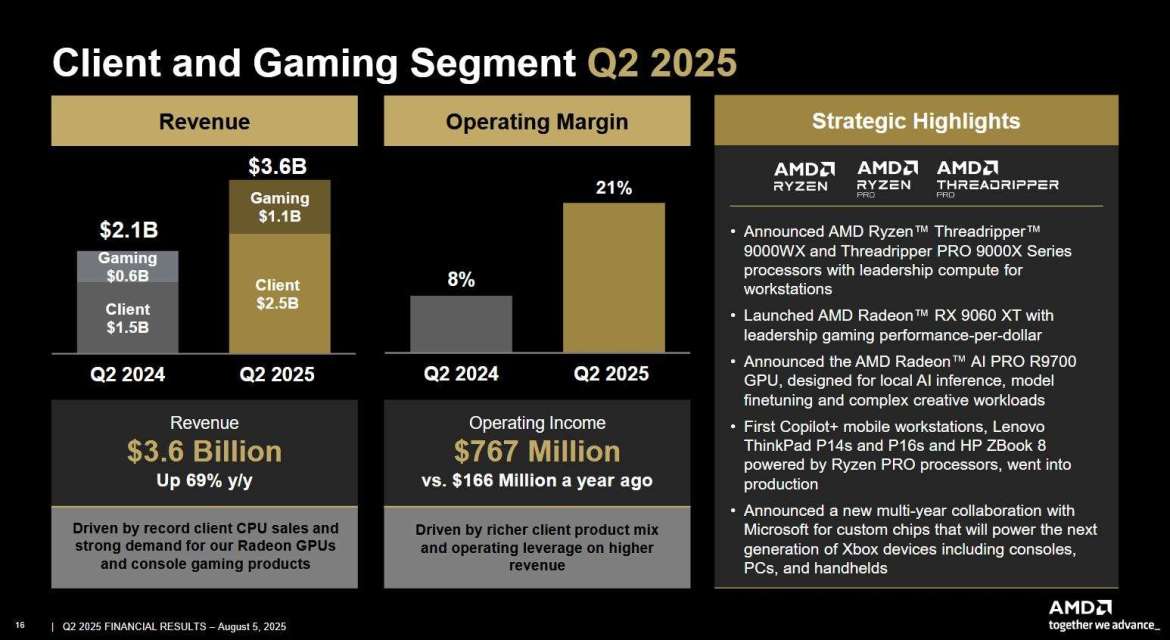 在收益报告在截至 2025 年 6 月 28 日的第二季度,这家芯片制造商介绍了其最近宣布的与微软在定制芯片开发方面的新的多年合作。演示中详细阐述了这些 AMD SoC 将为下一代 Xbox 设备提供动力,不仅包括游戏机,还包括 PC 和手持设备。