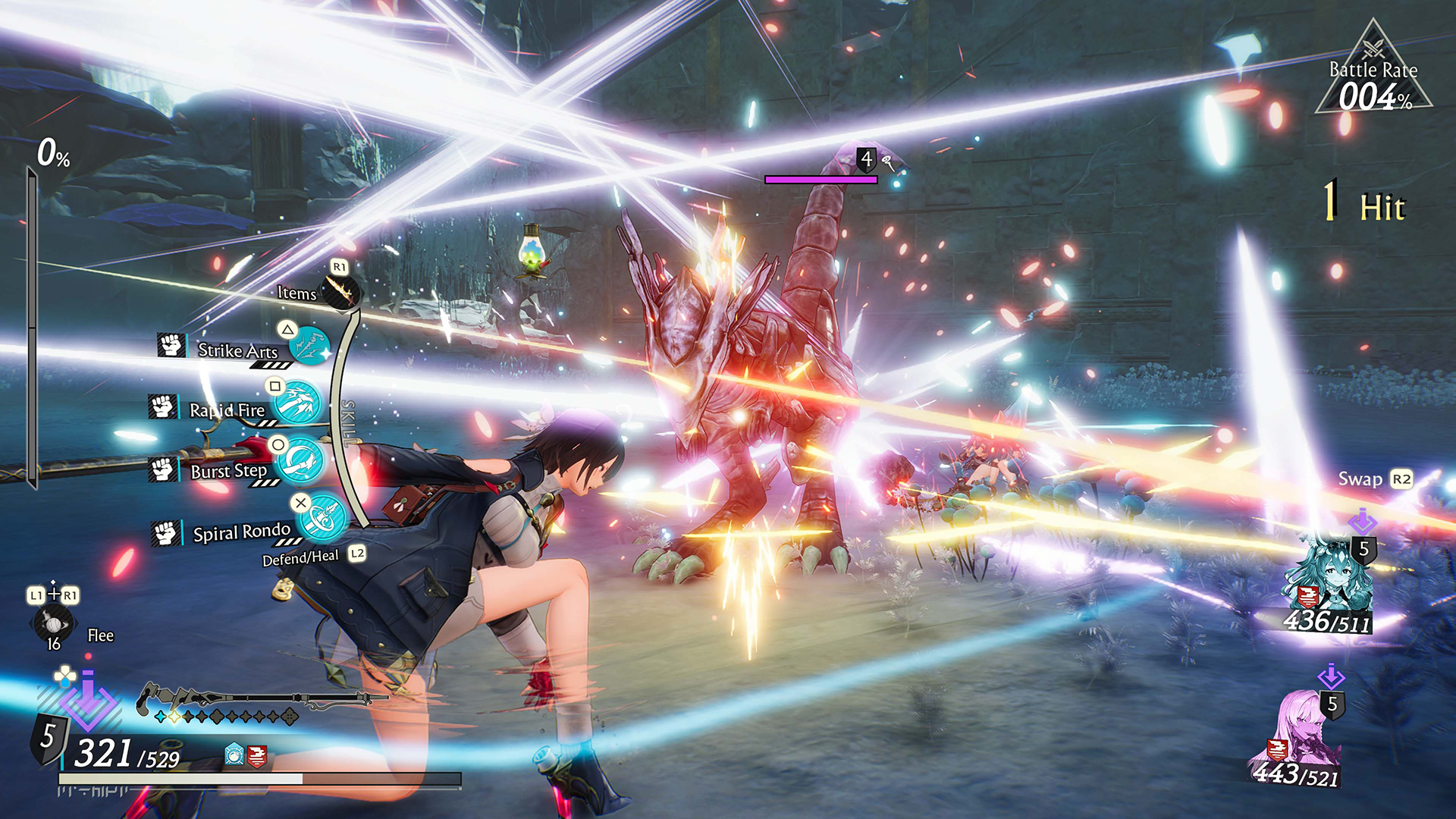 战斗是实时的,有两种类型的攻击范围。玩家可以切换技能来进行策略性的战斗。合成物品可以变形为剑或矛等形状进行攻击。此外,这些物品是可重复使用的。
