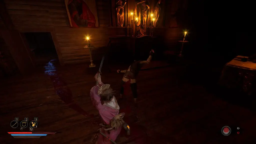 战斗混合了日本和欧洲的武器,主角在战斗中在人类和恶魔形态之间切换。她的转变带来了獠牙、角和利爪猛击,深受游戏民间传说的影响。潜行仍然是一个主要焦点——从屋顶跟踪、攀爬城堡墙壁,或者用诱惑引诱守卫,然后从阴影中杀死敌人。