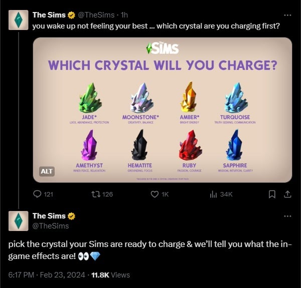 今天早些时候,模拟人生团队在 X(以前的 Twitter)上发布了一篇帖子,展示了游戏中的所有水晶,以及作为新资料包一部分推出的全新独家月光石、翡翠和琥珀水晶。该团队要求社区用他们最喜欢的水晶回复帖子,他们将透露他们会在游戏中产生什么类型的效果。