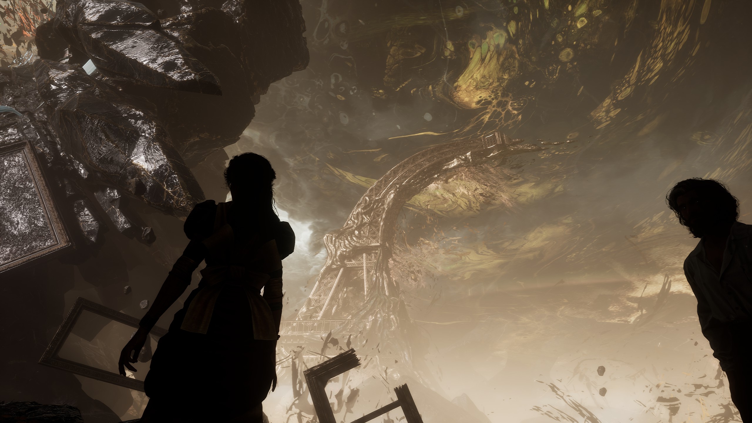 至少,这是我的逻辑。我支持艾丽西亚保留画布——毕竟,这就是我们在整个游戏中都在努力做的事情——但如果说以前的氛围很可怕,那么现在它们就彻底腐臭了。随着黑白的结束过场动画(现在悲伤的事情的通用过滤器),毫无疑问,画布,无论它以前是什么,现在都是对生活的令人不安的模仿。这群人和他们的亲人聚集在一起观看维索在歌剧院的演出,他脸上的困顿清晰可见。这是完美的一天——你会感觉以前也发生过这样的一天——脸上涂着彩绘,而艾丽西娅却在现实世界中死去。