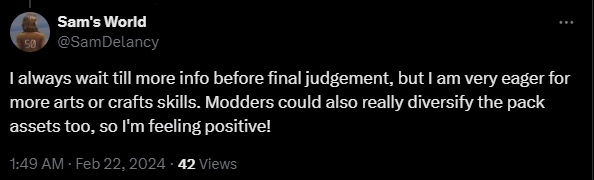 另一方面,虽然一些玩家表示新的资料包不一定适合他们,但他们很想在它发布后了解更多信息,以及自定义内容和 Mod 创建者可以使用该资料包做什么。