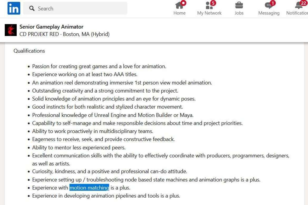 此外,工作资格清单中还提到了动作匹配经验作为加分项,这表明《赛博朋克2077》续作将利用先进的动画技术来实现更真实、无缝的动画。该职位的工作清单支持了这一点首席遭遇设计师CD Projekt Red 表示,工作室正在寻求创建“迄今为止任何游戏中最真实、最具反应性的人群系统”。它可能打算通过使用运动匹配技术在游戏过程中使用系统的动画方法来实现这一目标。