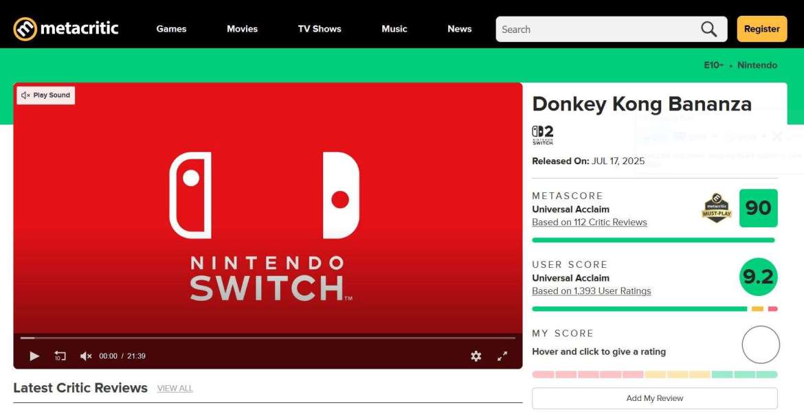 《Donkey Kong Bananza》已成为综合网站 Metacritic 上用户评分最高的任天堂游戏。