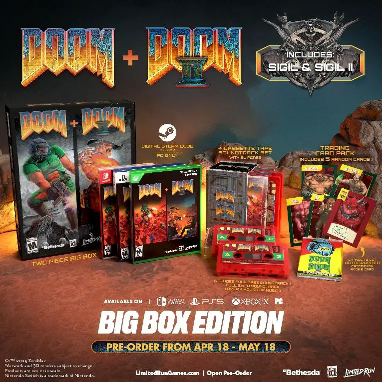 Limited Run Games 宣布了新的实体版毁灭战士 + 毁灭战士 II与贝塞斯达软件公司合作。预购将于 2025 年 4 月 18 日开始,计划在 PlayStation 5、Xbox Series X|S、Nintendo Switch 和 PC 上通过三个版本发布。