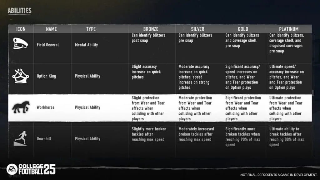 EA College Football 25 引入了强大的球员能力系统,允许每位球员最多八项技能,这些技能可以是身体技能,例如增强抢断或接球能力,也可以是精神技能,例如在压力下提高领导力。此功能增加了玩家发展和游戏策略的深度,与之前 EA Sports 游戏中的类似系统相呼应。