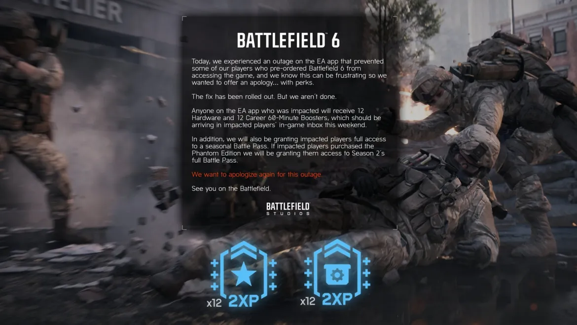 艺电有宣布今天早些时候尝试访问《战地 6》时遇到 EA 应用登录问题的玩家将获得一系列游戏内奖励,包括 XP 增强器和免费的季节性战斗通行证。此次赔偿是在一次中断之后进行的,该中断暂时阻止了电脑用户,特别是那些预购了游戏的用户启动或访问其内容。