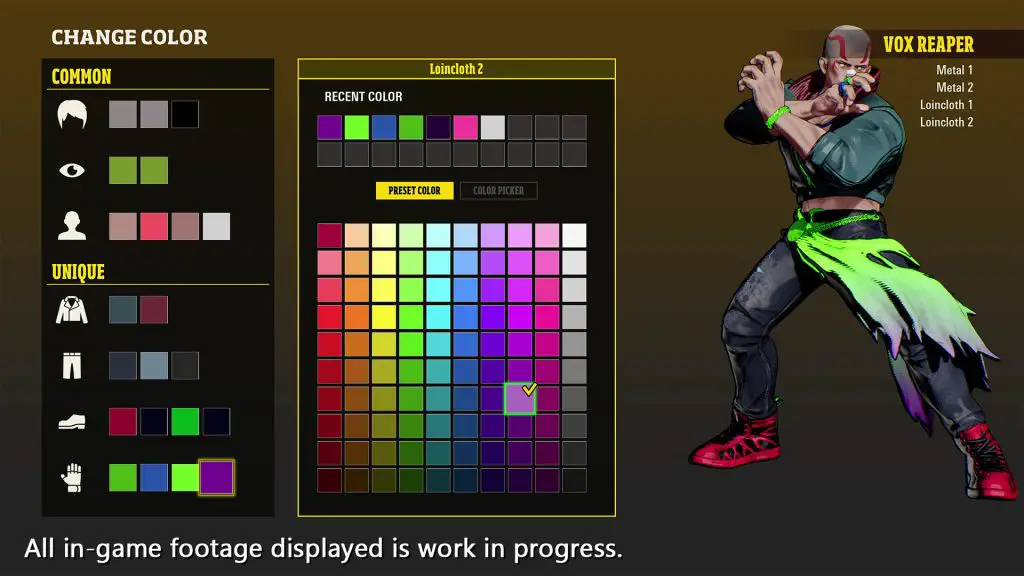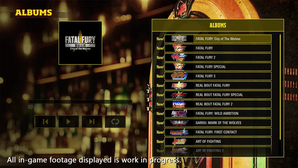 《饿狼传说:狼之城》还将具有回滚网络代码和跨排名、休闲和房间比赛的跨平台功能,以及提供玩家风格克隆的人工智能。最后,战士可以通过服装和装备颜色以及图案进行定制,这些都是从 EOST 中解锁的。此外,还将提供自动点唱机,其中包括《格斗艺术》中的音乐。可以在特定模式下为美洲狮音乐制作播放列表。