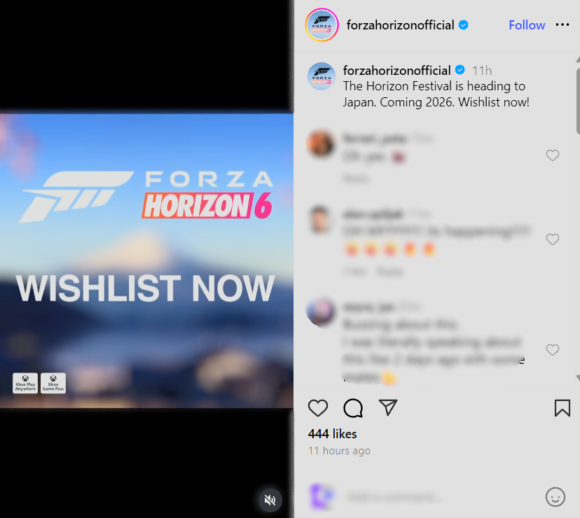 看来微软的下一款大型赛车游戏已经提前公布了。 Forza Horizon 6 的广告已开始出现在Instagram,确认地平线嘉年华将于 2026 年在日本举行。这篇由《极限竞速:地平线》官方帐户上传的宣传帖子敦促玩家将这款游戏列入心愿单,这几乎证实了长期以来的传闻。