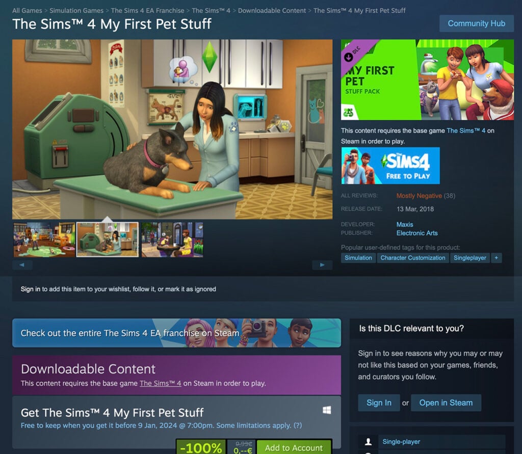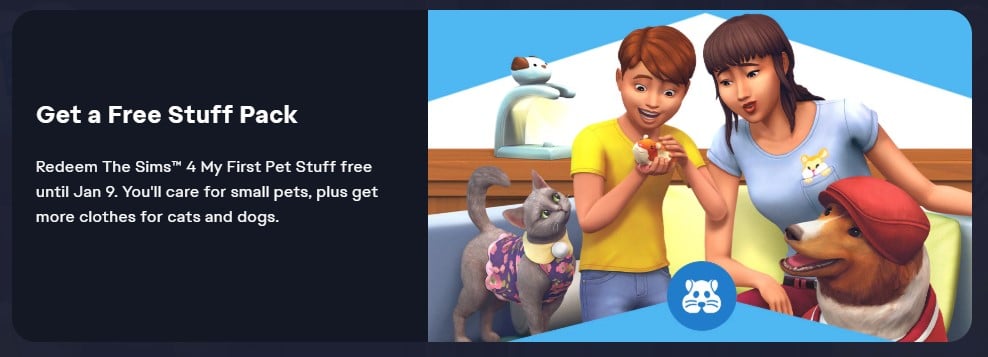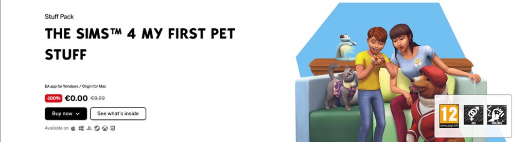 您只能在 PC Windows 和 Mac 上支持《模拟人生 4》的平台上领取《模拟人生 4 我的第一个宠物物品包》。到目前为止,我还无法在 Playstation 和 Microsoft Store 上找到该优惠。如果有任何更新我会更新这篇文章!然而,考虑到这个包在 EA 之外的在线零售商店上分发(和更新)有多复杂,我对此表示怀疑。