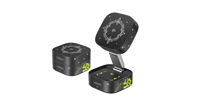 UGREEN MagFlow 无线充电器 Genshin Impact 版,一款兼容 Qi2 MagSafe 的无线充电器,具有 15W 快速充电功能,结合了磁性垫、耳机底座和额外的 USB-C 智能手表端口。