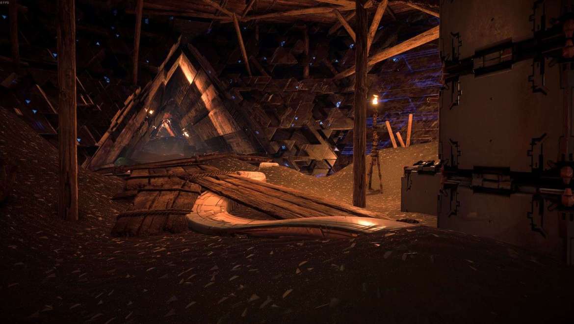 在上面的比较中,原始场景看起来很平坦,木梁无法投射阴影,环境遮挡最小,地面纹理对光线的反应不佳。在重制版本中,光束投射阴影,灯光与地面正确交互,并且添加了体积雾,增强了气氛。