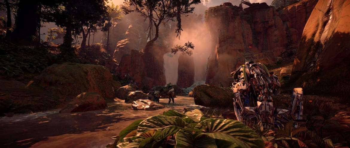 在上面的比较中,《地平线 零之曙光重制版》中的树叶更加细致,并且由于改进的光照模型而呈现出更自然的色彩。地面和环境中其他地方也有更多细节。
