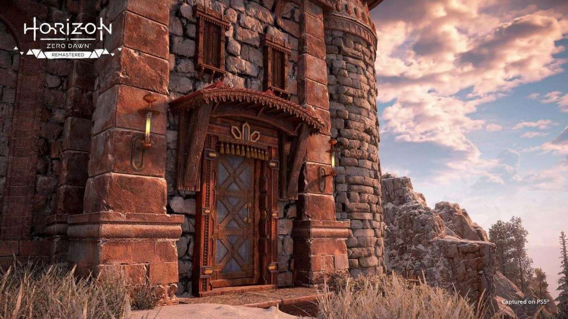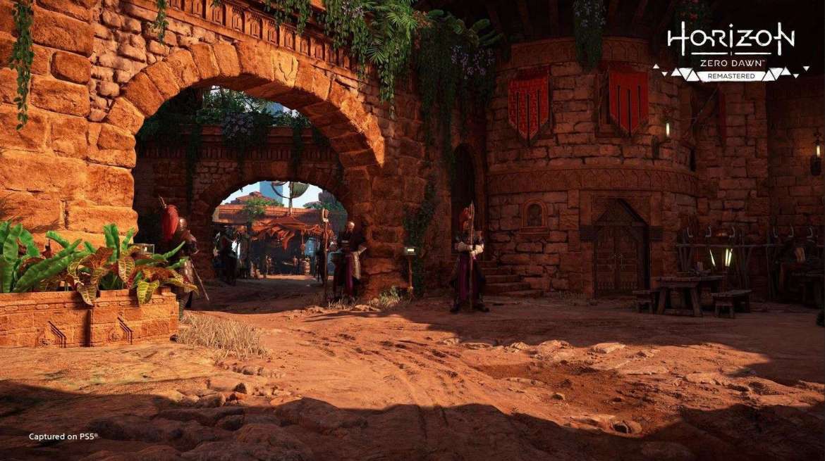 原版《地平线:零之曙光》中的建筑物以扁平、基于纹理的外观为主,灯光过于明亮,建筑物平面之间没有分隔。在《地平线零之曙光重制版》中,砖块经过完全建模,增强的照明和材质清晰地定义了结构的不同部分,创造了更加真实的外观。