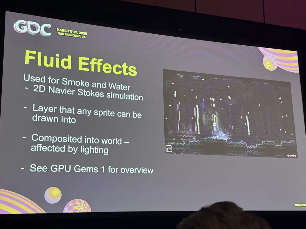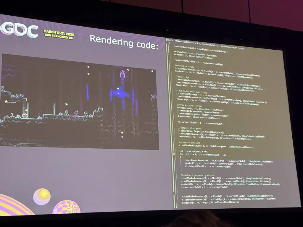 受 Jos Stam 的实时流体动力学算法的启发,他甚至为烟雾和瀑布等物体构建了自定义流体模拟。该系统分为速度、压力和发散图层,为游戏环境带来可信的运动。在性能方面,Basso 针对每个平台(包括 Nintendo Switch)仔细调整了它。