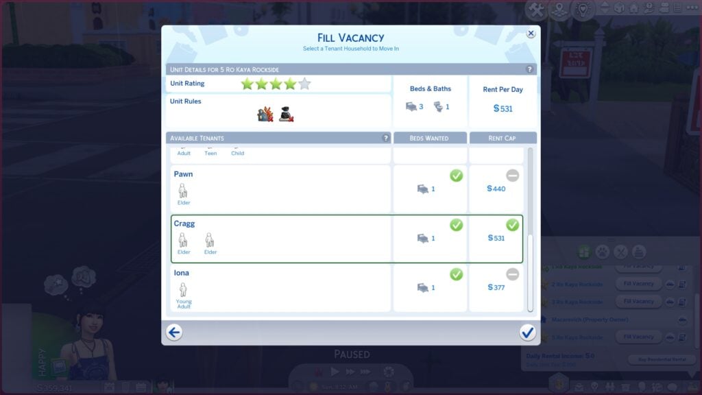 选择最适合您单位的家庭,瞧!您现在有租户居住在您的住宅租赁中,他们(希望)将支付每日租金。您正在成为一名富有的《模拟人生 4》业主!