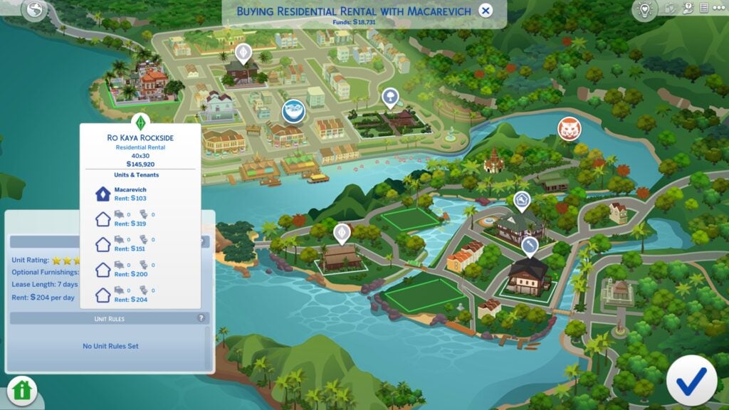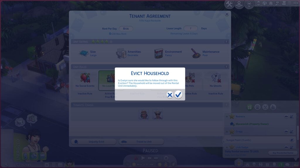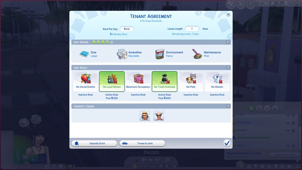 在“租户协议”菜单的顶部,您将看到可以收取的租金和租约期限。您可以为某个单元收取的最高租金取决于其星级,而星级则由其大小和您的装修方式决定。然而,大多数租户不愿意支付单位的最高租金,因此在平衡租金时请记住这一点。您还可以将租金设置为 0,让模拟市民免费住在那里。这不是最有利可图的计划,但对于您不想向亲戚收取租金的多代住宅非常有用。