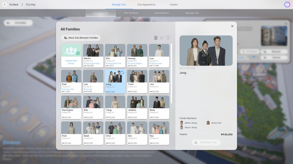 您可以在此菜单中以几乎任何您想要的方式自定义家庭成员和资产;你可以调整哪些Zois住在哪个家庭(注意;任何婴儿或幼儿阶段的Zois都不能移动),你可以将家庭合并为你希望他们居住的地址一侧的家庭,你可以改变两者之间的资产比例,世界是你的牡蛎!