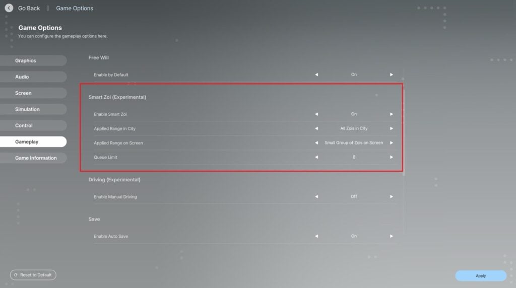 Smart ZOI功能是一项可选的,正在进行进步技术中,为整个城市的所有ZOI提供了独特的自主权。管理智能ZOI功能和选择您正在玩的城市范围的层次有不同的层次,应该启用该功能。