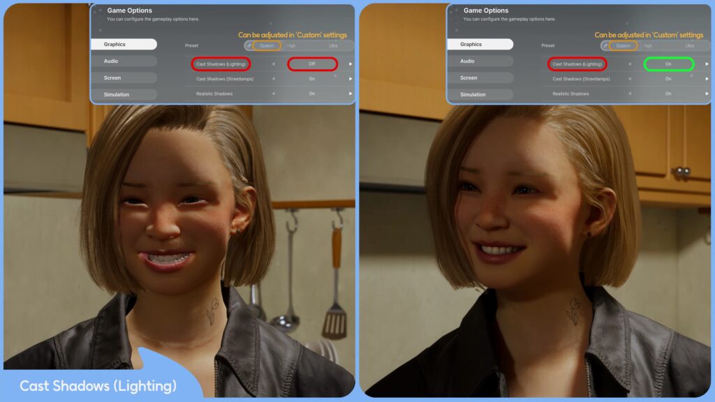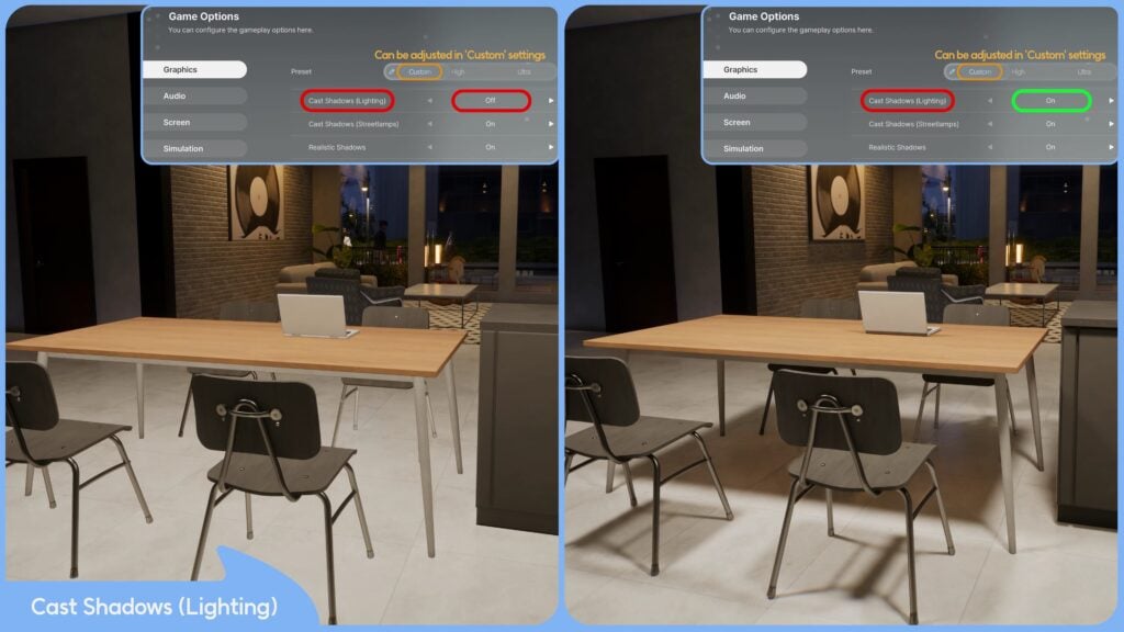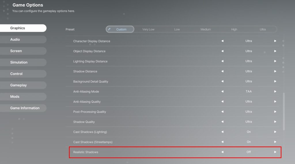 - 效果:添加了一个新选项,允许玩家最大限度地提高阴影质量。启用后,阴影将显得更清晰、更细致,从而增强游戏的整体视觉真实感。