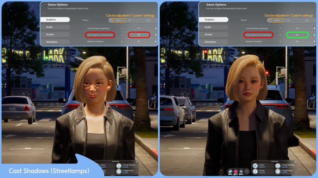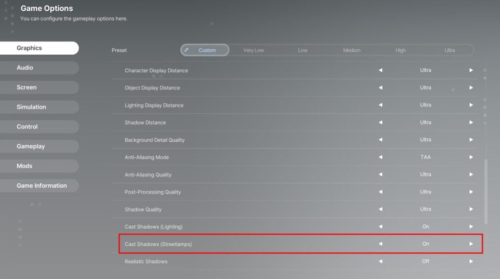 ㄴ您可以通过导航到“选项”>“图形”>“自定义”>“街灯阴影”来打开或关闭它