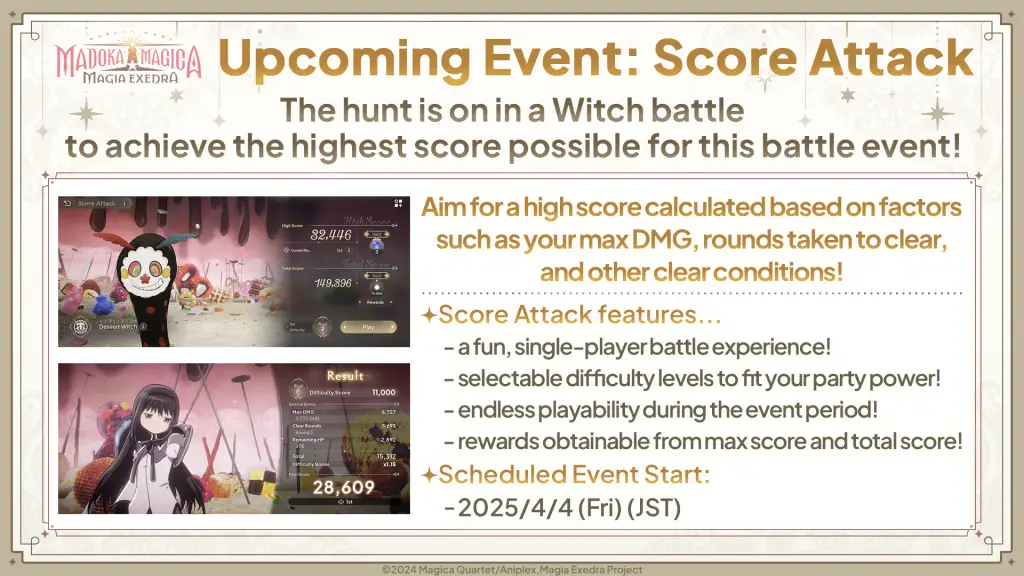 新的战斗活动“Score Attack”将于 4 月 4 日星期五 12:00 开放。在这种战斗模式中,玩家将与女巫战斗,争取更高的分数。高分是根据最大伤害、通关回合数以及玩家通关游戏的条件来计算的。