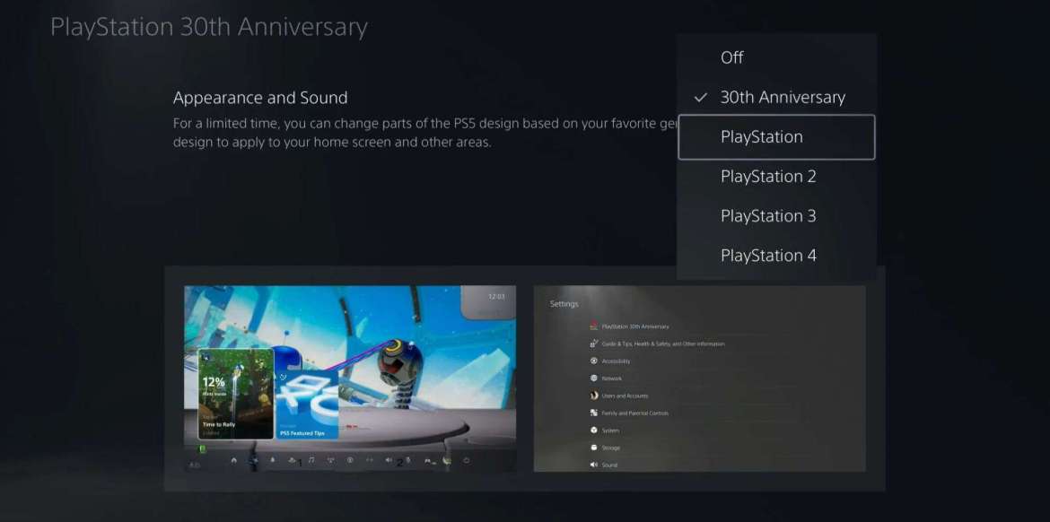 新的 PS5 开机画面是显示的与初代 PS1 上的一模一样,后面是另一个屏幕,显示 PlayStation 30 周年纪念标志。当主屏幕加载时,用户会看到一个新选项,可以自定义背景,以具有基于 PS1、PS2、PS3 或 PS4 主屏幕的设计和声音效果。