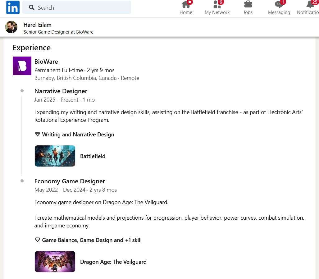 根据达拉所说,下一个质量效应项目目前无法利用完整的开发团队,该游戏很可能仍处于预制作阶段。因此,我们可能不会很快看到它。 Bioware 开发人员目前正在进行的其他 EA 项目之一是下一款《战地》游戏。 LinkedIn 个人资料哈雷尔·埃拉姆,BioWare 高级游戏设计师,他是