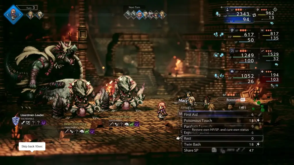 《八方旅人 0》保留了该系列标志性的“突破与提升”回合制战斗系统,并引入了能够带领 8 名党员(而不是 4 名)参加战斗的功能。本质上,玩家将每个前线战士与他们可以随意更换的人配对,根据战略考虑来决定每个人在阵容中的位置。战斗的流程使得利用弱点成为必要,因此你需要确保基地得到覆盖,并避免将能够击中相同漏洞的人员堆叠在一起以防止冗余。