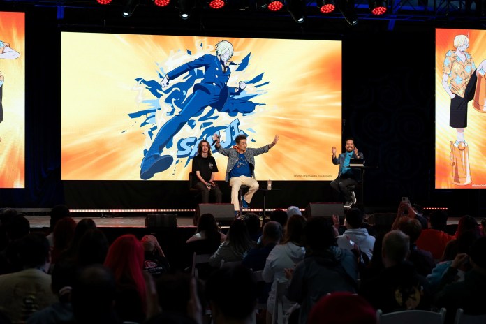 Sanji的日本配音演员Hiroaki Hirata和制片人Ryuta Koike也出席了会议。 Hirata在舞台上扮演了他的标志性角色,观众中的歌迷当然被他的表演所感动。