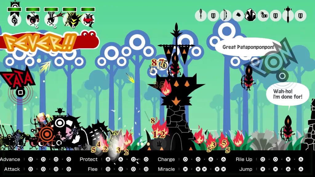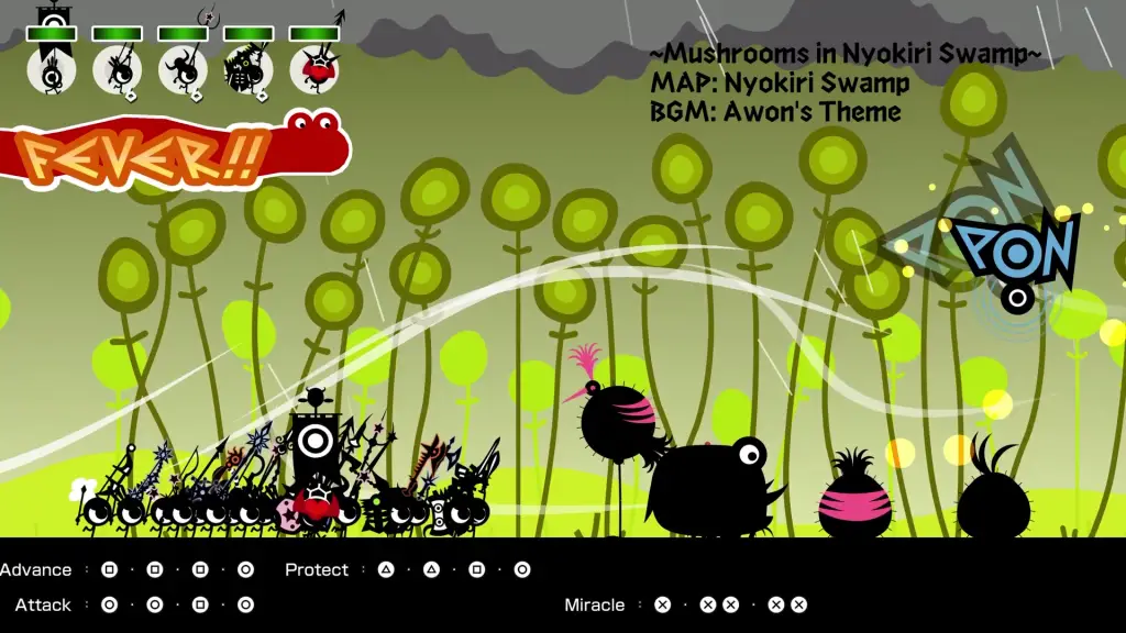 对于该系列的新手,您可以扮演 Patapons 的神,以四拍乐句敲击四个神圣的鼓:Pata、Pon、Don 和 Chaka。 “Pata Pata Pata Pon”带领小队前进,而“Pon Pon Pata Pon”则告诉矛兵放飞。我的前几分钟很艰难;多年之后,时机感觉很陌生,万代代表善意地指出了每一个不寻常的失误。一点友好的玩笑就是我所需要的动力。一旦肌肉记忆恢复,狂热状态就会爆发,伤害倍增,突然间没有人可以阻止我成为最好的,或者至少进入前三名。