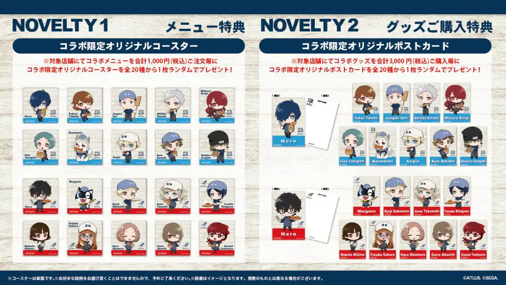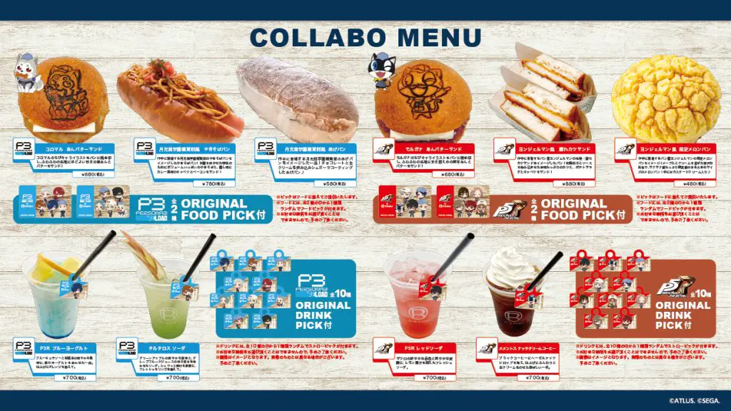 每份食物订单均随机附带两种独家食物之一,主题为《女神异闻录 3:重装版》和《女神异闻录 5:皇家》。饮料包括十种原创饮料精选之一,也是随机分发的。