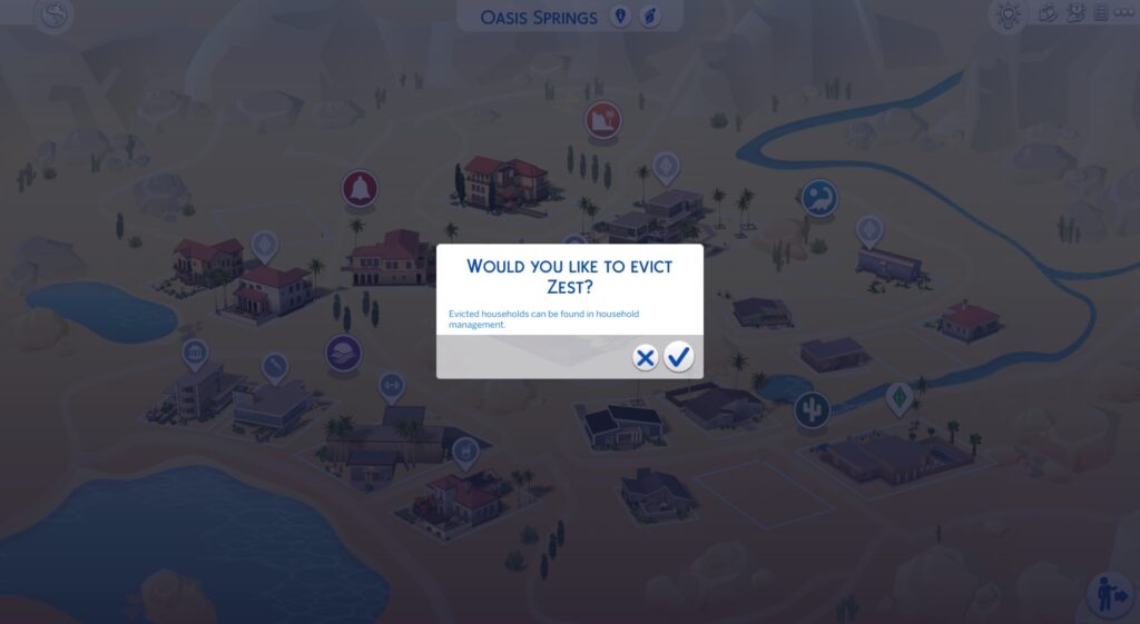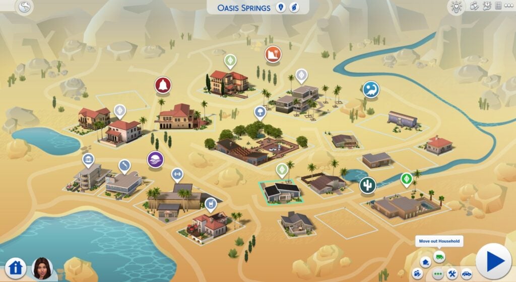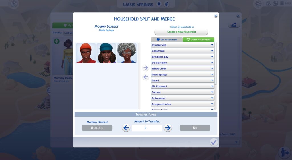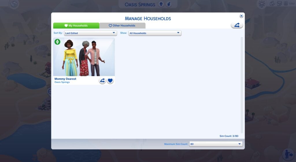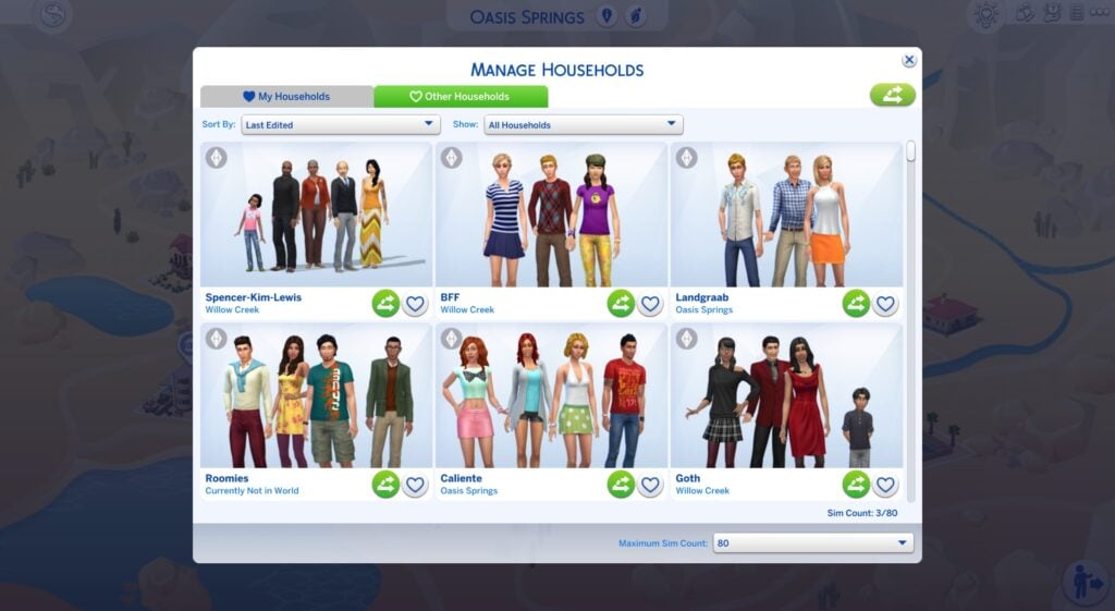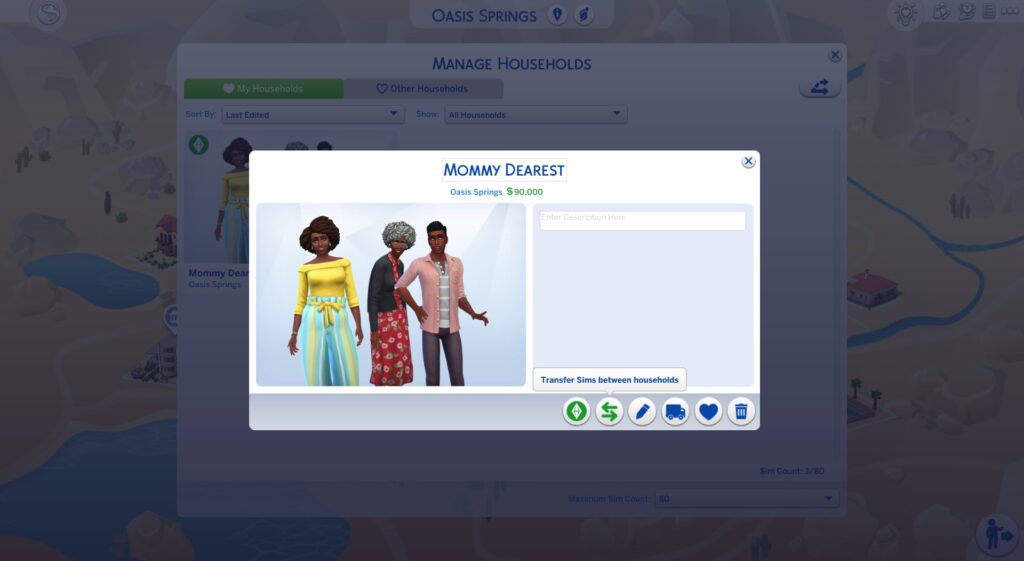 如果您想更多地控制您的家庭,尤其是管理多个家庭,“管理家庭”菜单是您最好的朋友。单击世界地图右上角的两个用笔的模拟人生图标,打开“管理家庭”菜单。您可以在此处访问游戏中的任何家庭,包括随机生成的城镇居民。