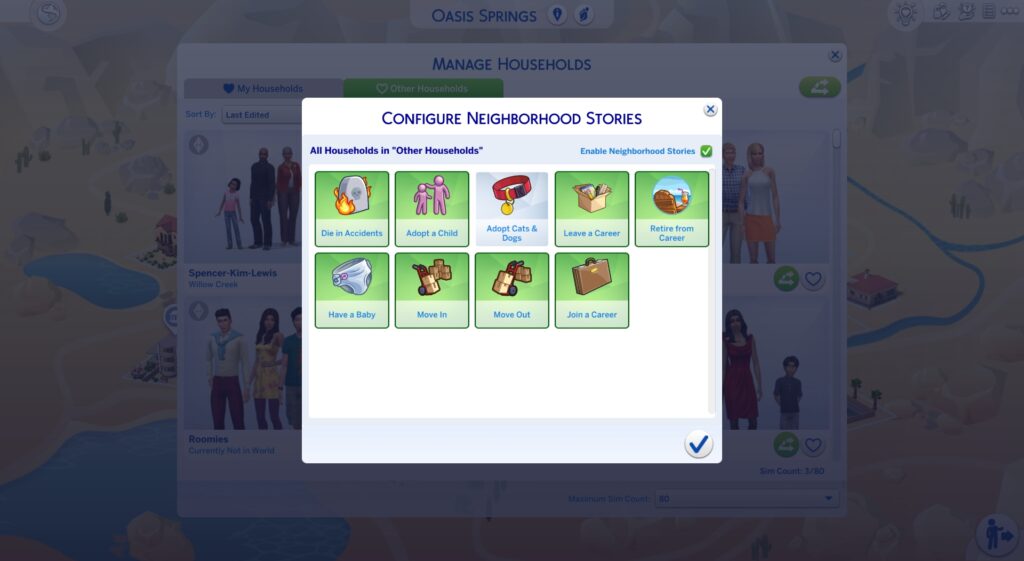 默认情况下,将对“其他家庭”启用“邻居故事”,对“我的家庭”禁用“邻居故事”。您可以通过单击任一选项卡右上角的图标来更改此设置。单击它可以自定义此选项卡中的所有家庭是否会死于事故、收养孩子或宠物、生孩子、加入/离开职业、搬入/搬出,或者在您不玩它们时自行退休。您可以选择全部、不选择或仅选择其中一些。