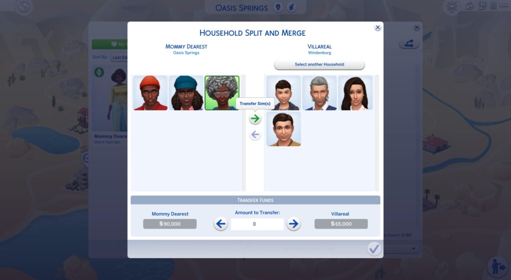 在选择家庭的“管理家庭”屏幕上,单击两个指向相反方向的箭头图标。这是家庭之间转移模拟市民工具。会弹出一个新菜单,如下图: