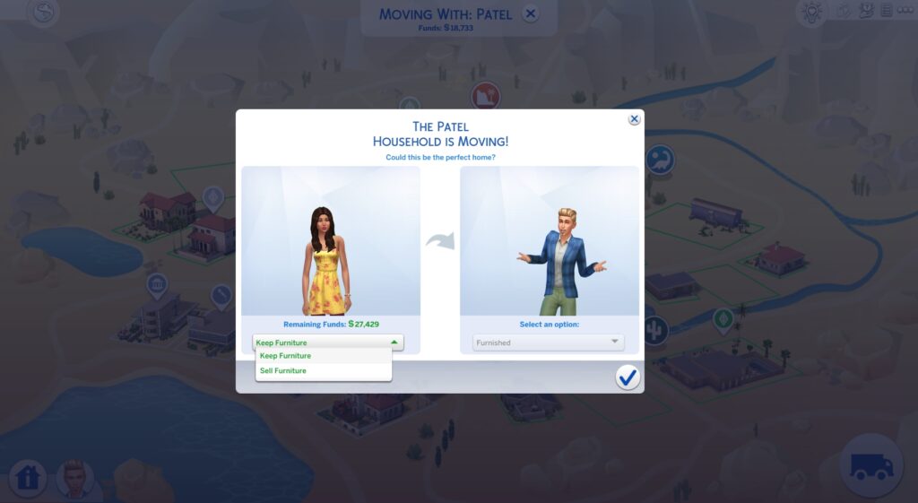 选择家庭,单击更多,然后单击移动家庭。然后为他们选择另一处他们能负担得起的房子搬进去。当您选择新家时,系统会询问您是否要出售旧家的家具或保留它。如果您想留下家具,请选择出售家具。老房子将为任何未来搬入的模拟人生保留所有家具。如果您想携带家具来装饰新房子,请单击“保留家具”。家具将进入家庭库存,使旧房子空着。