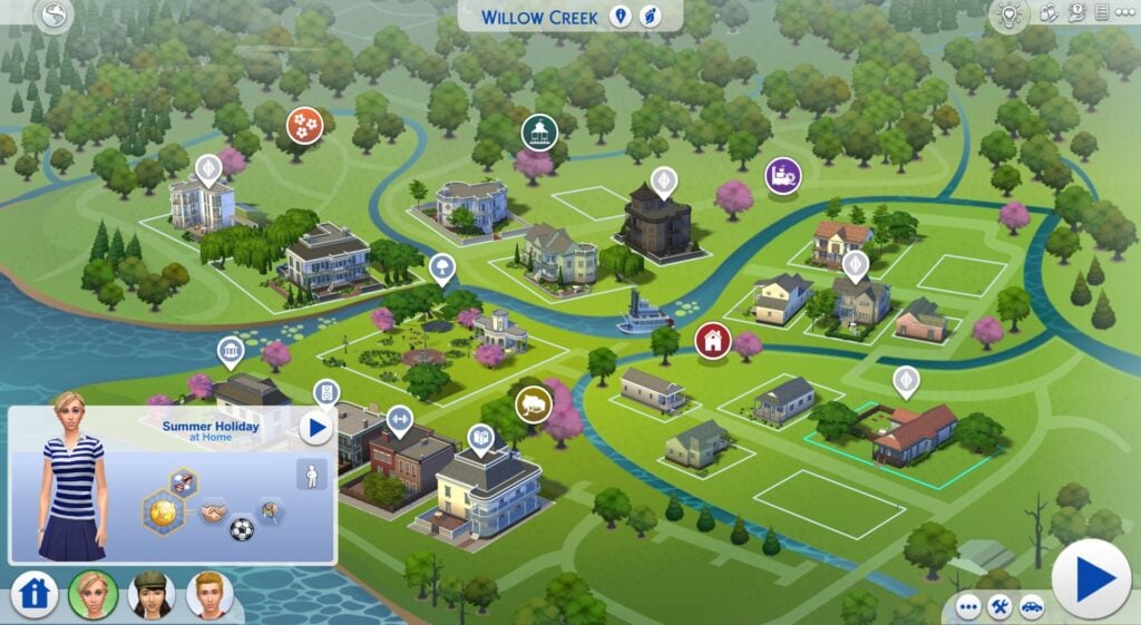 如果你想管理个人家庭怎么办?这是100%可行的。有几种方法可以做到这一点。第一个也是最直接的方法是点击居住在该世界中的任何模拟市民的家。新图标将在底角弹出。在左侧,您可以通过打开肖像来查看有关家庭的更多信息。在右侧,您将看到“构建”、“访问”、“播放”和“更多”图标。要管理此家庭,您需要单击“更多”图标。