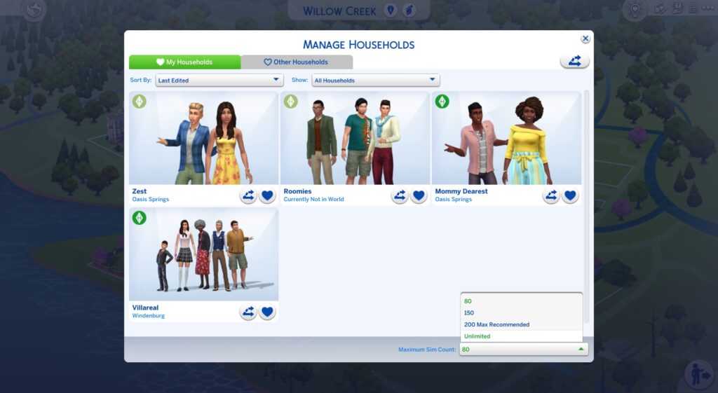 家庭分为两类。我的家庭和其他家庭。已玩过的家庭将移至“我的家庭”,而未玩过的家庭则留在“其他家庭”中。您可以通过单击家庭肖像下方的心形图标在两个选项卡之间来回移动家庭。我们建议将所有主要家庭保留在“我的家庭”选项卡中,以便您在需要时可以更快地找到它们。默认情况下,“我的家庭”选项卡中最多可以有 80 个模拟人生(包括宠物)。您可以将限制增加到 150、200 或无限制。游戏建议最大数量为200。不建议无限,除非您有顶级的游戏桌面。