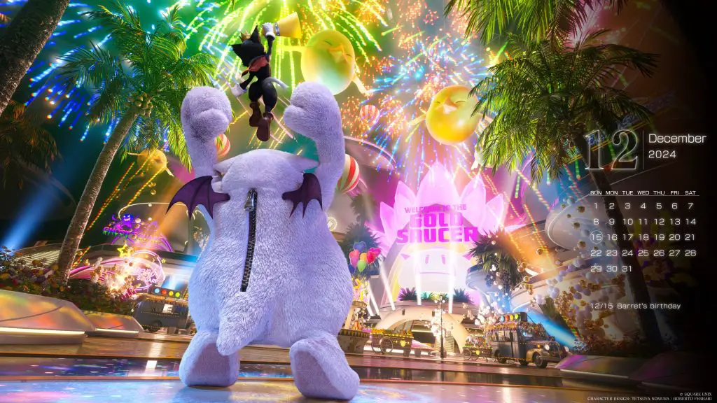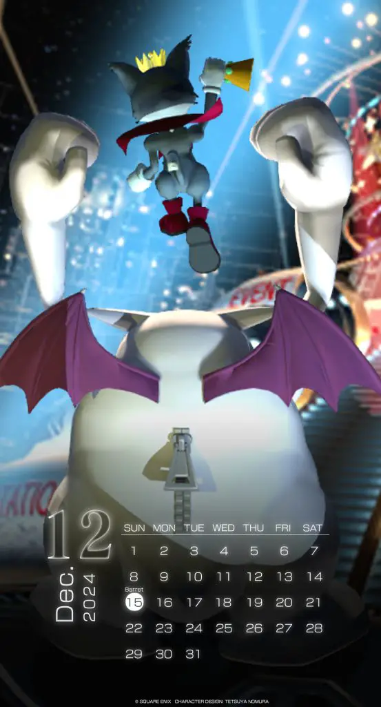 猫西斯的主要艺术是这次的焦点,描绘了他的原始模型和最终幻想 VII 重生模型以及他的莫古利。值得注意的是,12月15日被标记为巴雷特的生日。