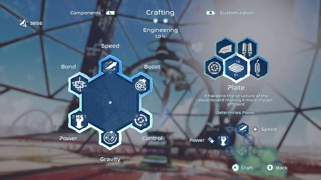 另一方面,涉及悬浮滑板的另一种升级途径则不必要地臃肿。这个想法是用地图周围收集的材料为你的设备创建零件,而实际的制作让你可以随意选择任何数量和数量的材料。这里有一种有趣的自由感,但增长的百分比却很小。即使同时收集和使用多种材料,结果也总是让人感到平淡无奇。亮点是由稀有材料 Gravitanium 制成的独特组件,甚至可以让您在水上骑行。但这只是一个例外,而不是常态。