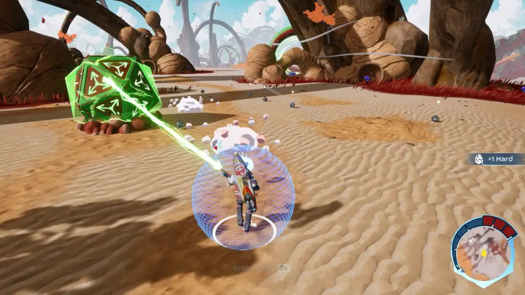 Cebete 星球广阔,鼓励玩家充分利用悬浮滑板的潜力,特别是其加速能力。当接近斜坡时,无论坡度有多小,按住相应的按钮都会进行跳跃,如果时机把握得当,你就会在空中翱翔。然后,通过扭转操纵杆在空中表演特技,在着陆时增加速度。这一壮举如果连续实施,影响力会更大,重复起来会令人难以形容地上瘾。另外,地图上的比赛要求你在限定时间内通过检查站,这使得这种练习值得掌握。