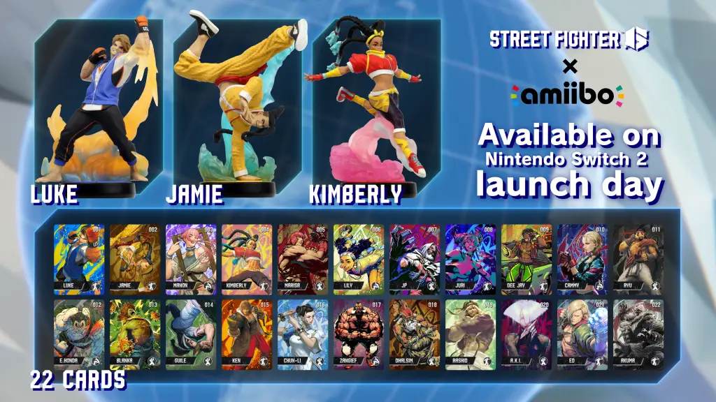 随着游戏机的发布,游戏中的角色 Luke、Jamie 和 Kimberly 的可收藏 amiibo 也将在游戏机发布时推出。另外,您还可以通过以下方式获得amiibo卡:入门包包含所有 22 个角色街头霸王 6 至第 1 年。未来还将推出具有新角色和设计的补充包。人物和卡片都可以在游戏中加载,解锁独家内容。