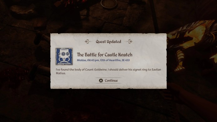 海岸畅通无阻后,沿着大厅走,直到到达伯爵宿舍的门。在伯爵的住所内,您将找到戈德温伯爵的尸体,你可以搜查他的身体并获得科洛维亚图章戒指呈现给 Savlian,其中还修复了该错误。再次与萨维安交谈一次,完成《上古卷轴 IV:湮没重制版》中的科瓦奇城堡之战,并获得一枚科瓦奇胸甲作为奖励。