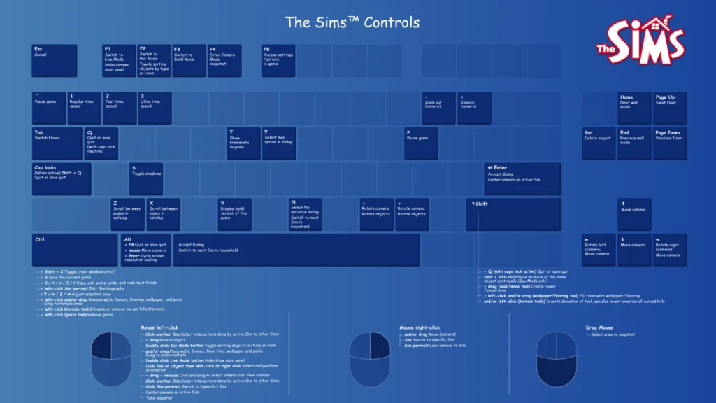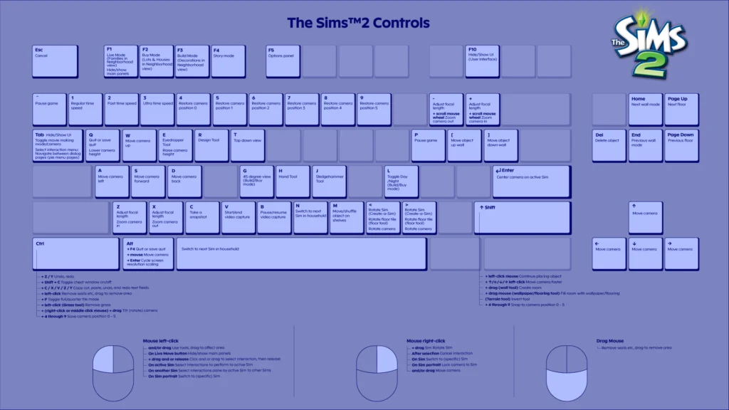 为了让您重温记忆,现在提供了使用键盘和鼠标玩《模拟人生 1》和《模拟人生 2》的官方控制指南。在玩游戏时,您可以找到导航实时模式、构建模式、购买模式和角色创建的所有方法。