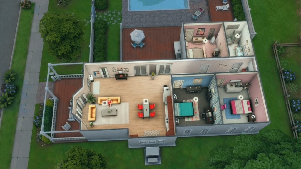 看来《模拟人生》团队终于看到了曙光——真的!看看这些装修有多明亮!笨拙的长厨房岛已被拆除,取而代之的是餐桌,客厅也进行了现代化的升级。他们的卧室终于在 2014 年离开,并获得了家具升级、有趣的壁纸和适合每个模拟人生个性的独特装饰。 (我对 Liberty Lee 的所有太空装饰品感到兴奋,直到我记起她从事宇航员职业。这里没有包装提示!)不幸的是,他们仍然共用一间浴室,但至少现在有双水槽。后院现在设有一个大型游泳池和一个舒适的花园。