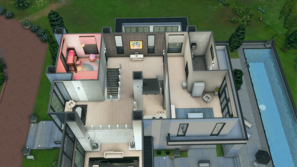 二楼进行了明亮的翻新,并添加了一些新设施。煎饼一家仍然不共用一间卧室,而是睡在自己的房间里。作为《模拟人生 4》基础游戏屋更新的一部分,鲍勃的卧室家具得到了升级,而电脑和健身器材则被拆除。 (另外,偷看挂在门上的他标志性红色长袍的小细节!)鲍勃的浴室也进行了现代化升级,但房子的这一部分确实变小了 - 因为他的房间旁边增加了一个新设施。一个未完工的托儿所可能暗示着他们未来的儿子,伊基,与他们一起上传到画廊,但也可能暗示不同类型的故事。也许他们本来打算要孩子,但有什么事情阻碍了他们,或者……等等,我别得意忘形!继续游览。伊丽莎的卧室一如既往地是粉红色的,距离她的卧室仅一扇门就有一间家庭办公室,那里曾经是一个甲板。
