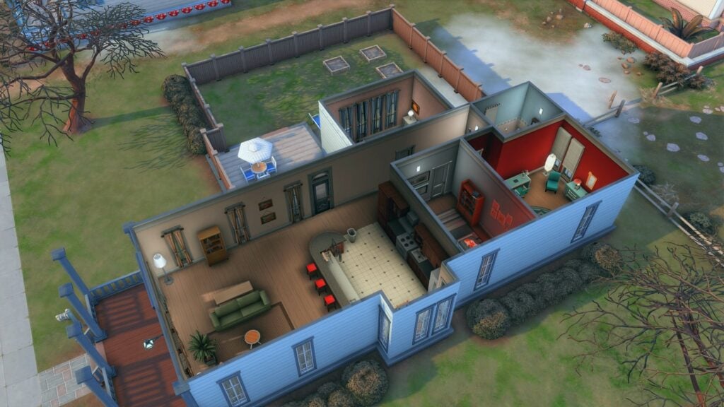 房屋的布局和本质保持不变,但每个房间都进行了更新,以反映每个模拟市民的个性,房屋的装饰具有有趣而多彩的 60 年代/70 年代氛围。添加了柱子,并抬高了厨房的地板。