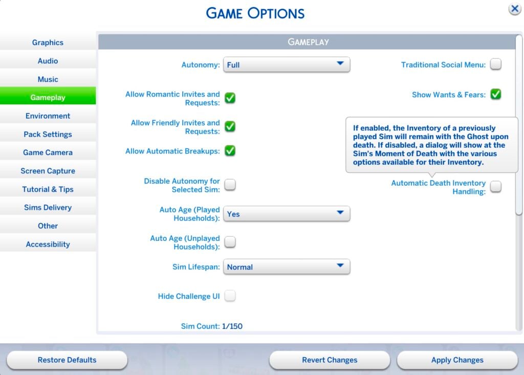 自动死亡库存处理:如果启用,之前玩过的模拟市民的物品栏将在幽灵死亡后保留在其中。如果禁用,在模拟人生的死亡时刻将显示一个对话框,其中包含可用于其库存的各种选项。