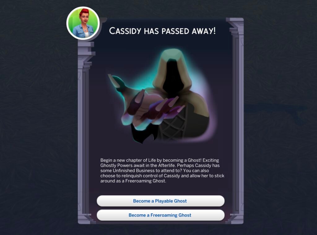 - 成为可玩的幽灵– 保持可玩的幽灵状态。该模拟市民将留在家族中,并继续作为当前家族中的幽灵存在进行游戏。